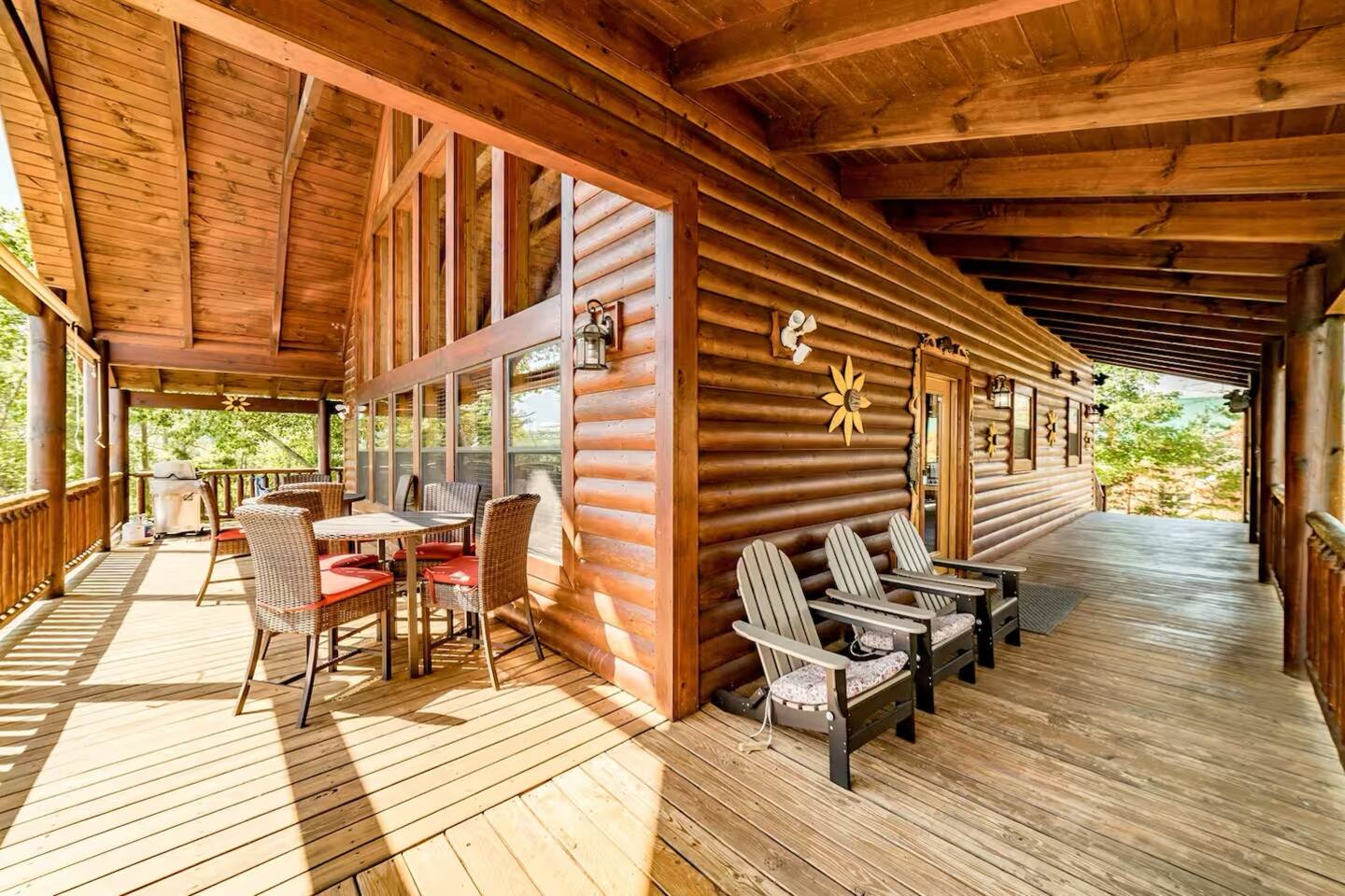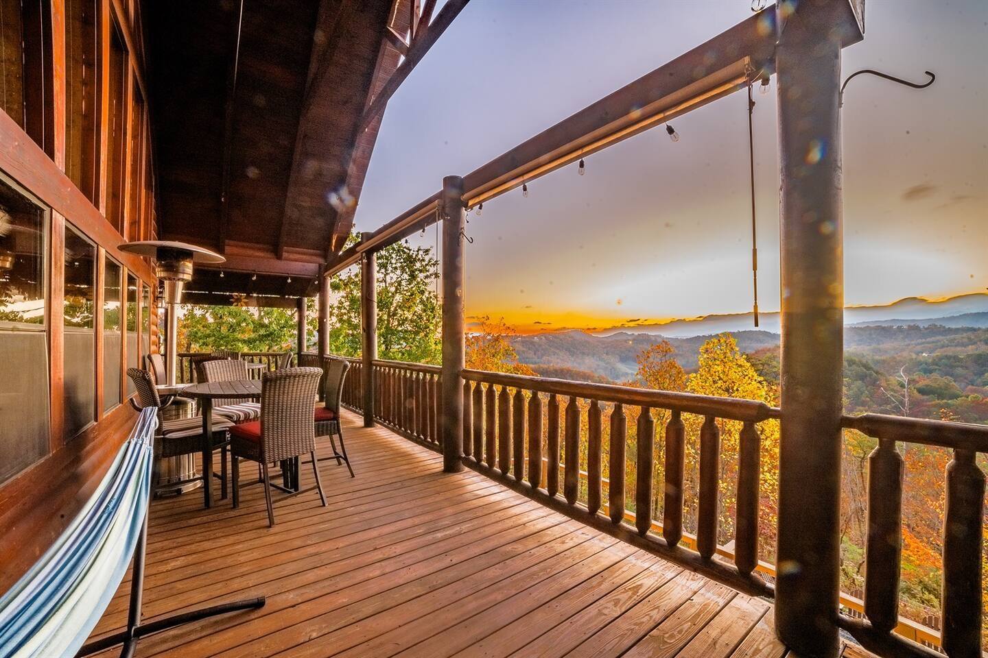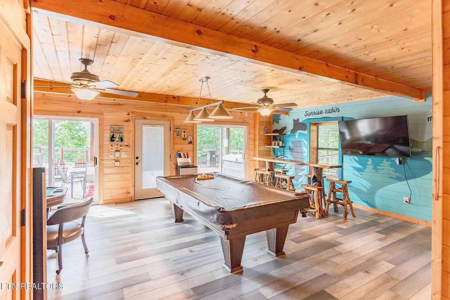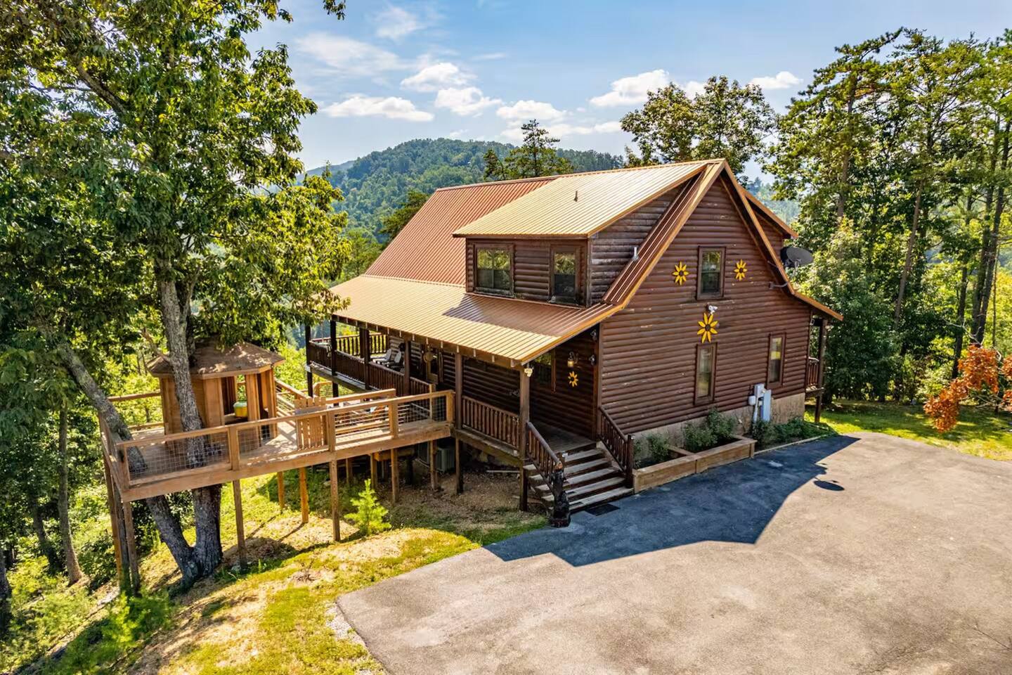 Sunrise Oasis – a 3,000 sq. ft. luxury Smoky Mountain cabin with 4 bedrooms + loft, 4.5 baths, and room for 14 guests. Enjoy wraparound porches, a huge event deck, fire pit area, hot tub, and breathtaking views. A $750 fee will be added for events and usage of 5 tables and 30 chairs. Features include a treehouse, outdoor kitchen, sports bar, poker area, game room, pool table, and arcade. There’s entertainment for the whole family and just 9 minutes from major attractions.