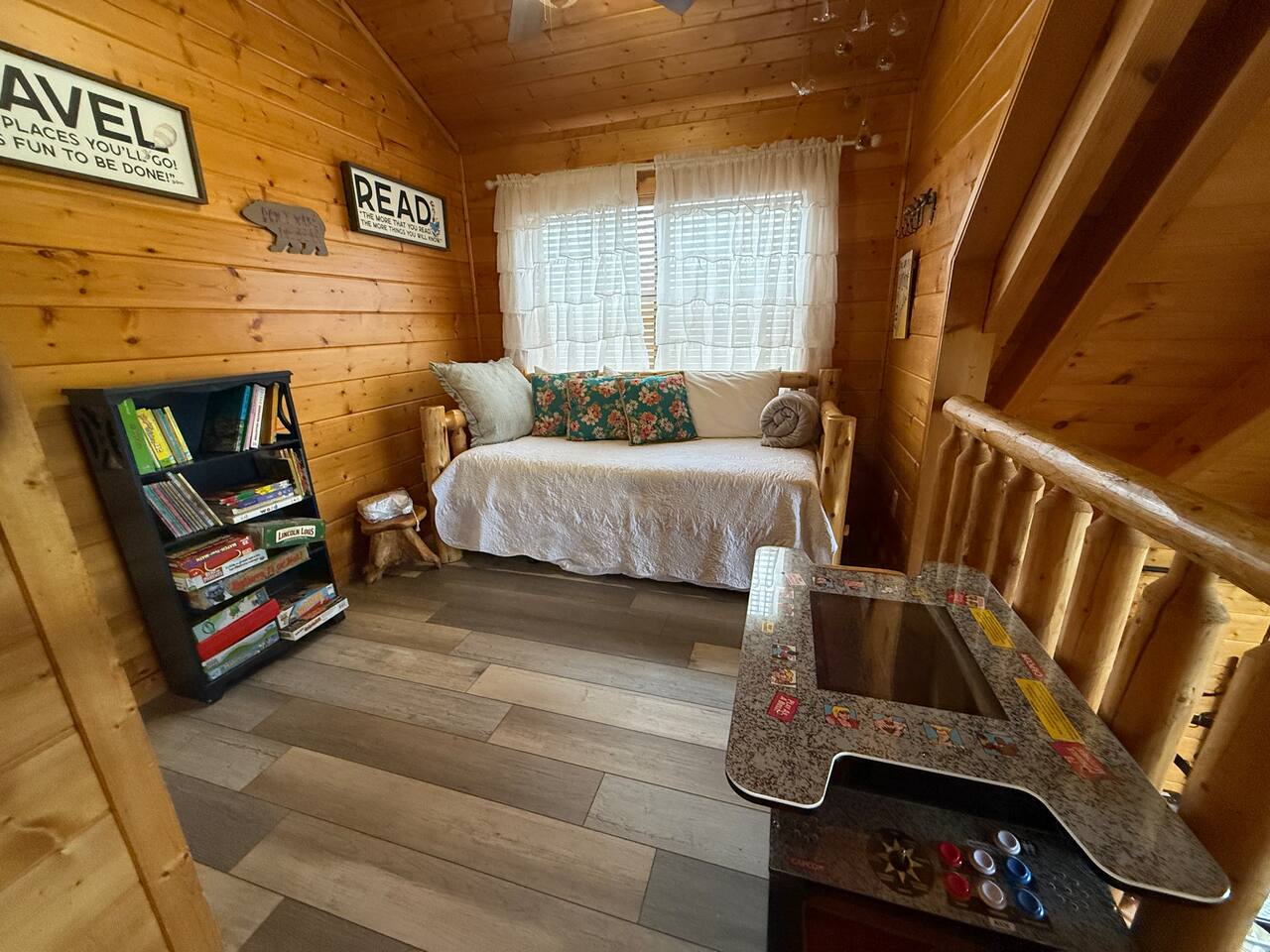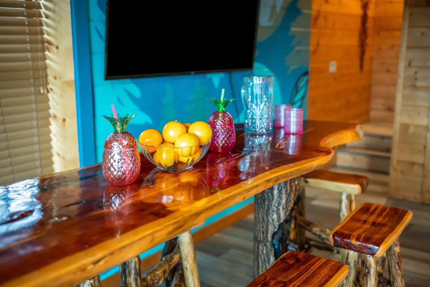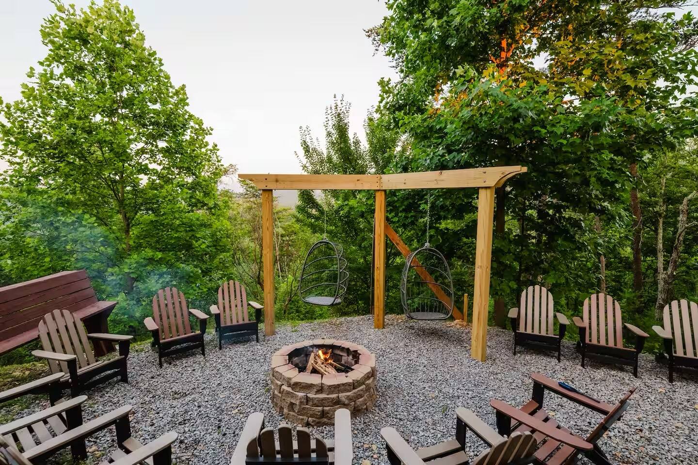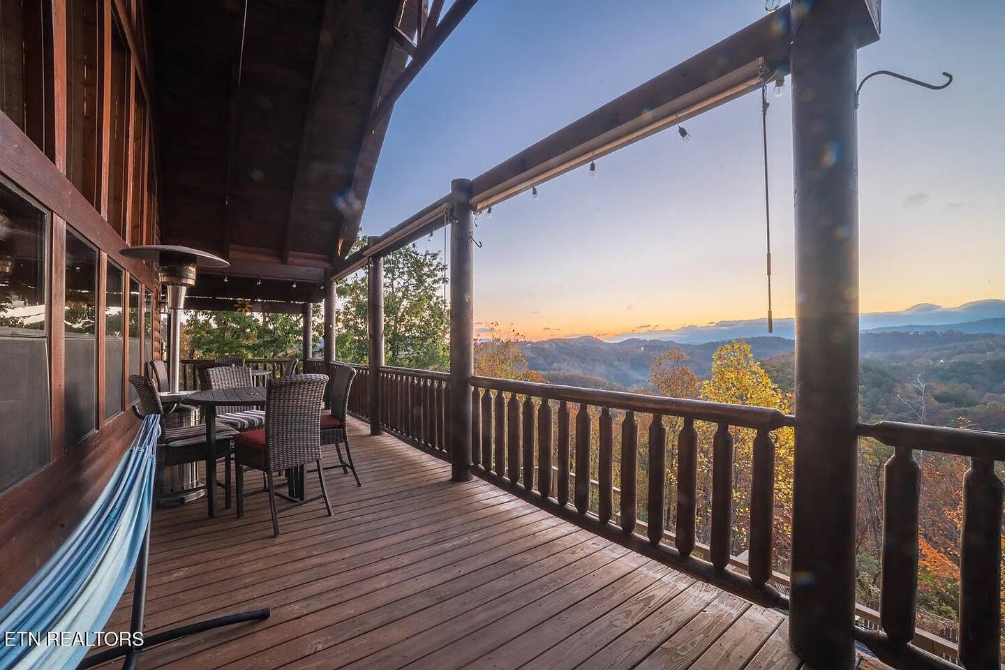 Sunrise Oasis – a 3,000 sq. ft. luxury Smoky Mountain cabin with 4 bedrooms + loft, 4.5 baths, and room for 14 guests. Enjoy wraparound porches, a huge event deck, fire pit area, hot tub, and breathtaking views. A $750 fee will be added for events and usage of 5 tables and 30 chairs. Features include a treehouse, outdoor kitchen, sports bar, poker area, game room, pool table, and arcade. There’s entertainment for the whole family and just 9 minutes from major attractions.