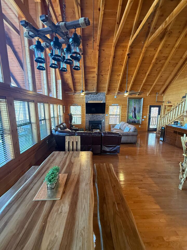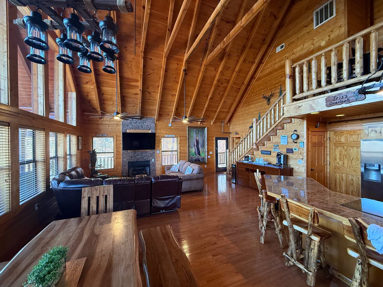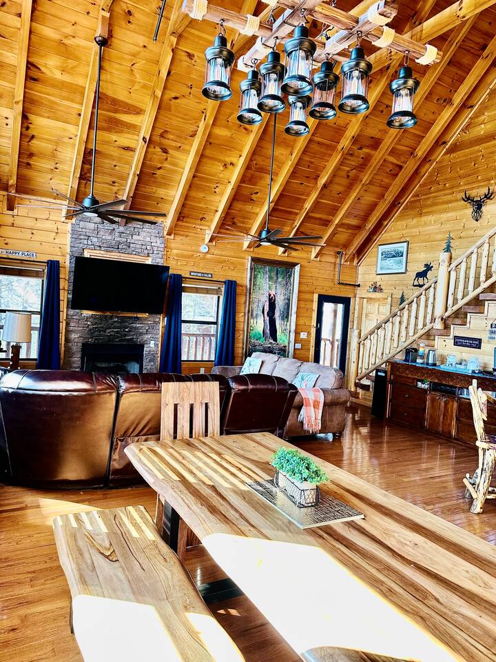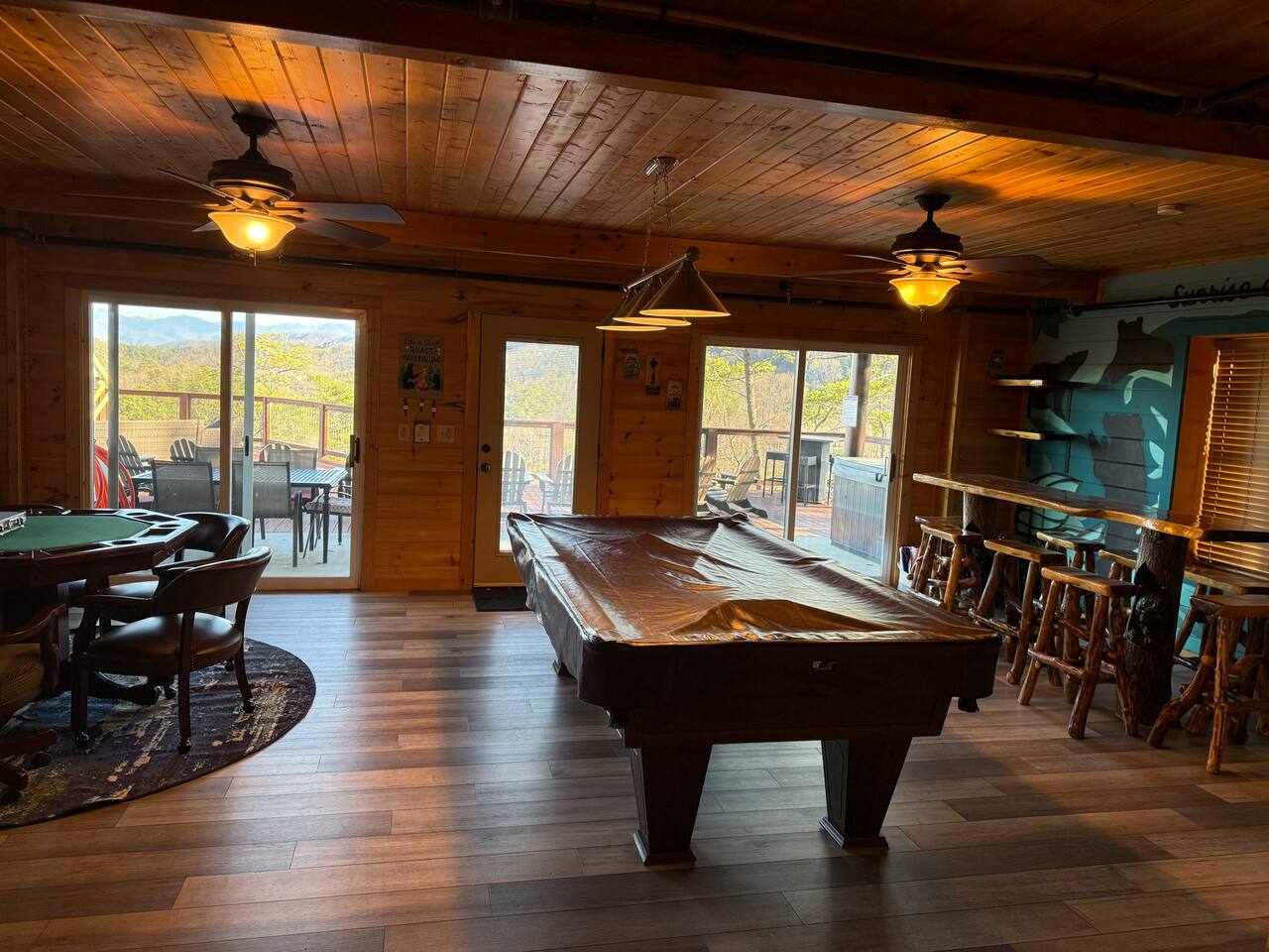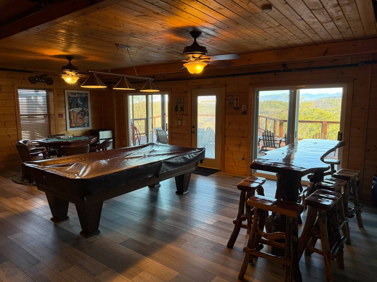 ✨ NEW OWNERS / NEW LISTING – Sunrise Oasis ✨ Welcome to Sunrise Oasis, a stunning 3,000 sq. ft. luxury Smoky Mountain retreat designed for relaxation and entertainment. The exterior space is truly one-of-a-kind, featuring a spectacular treehouse, observation deck overlooking the mountains, and a beautifully crafted outdoor kitchen, fire-pit, and game room. A huge event deck was completed in May 2025—perfect for unforgettable gatherings. $750 feet applies for events and 24 chairs and tables. Inside the Cabin Step inside to soaring windows framing unobstructed mountain views. The open floor plan features a spacious kitchen and dining area, fireside family room, and en suite bathrooms in every bedroom. Guests love hosting: family reunions, birthdays, corporate retreats, and getaways with friends. 🏡 MAIN LEVEL 🍽 Large Dining Room ⏲ Fully Equipped Kitchen 🪵 Fireside Family Room with TV 🚽 Powder Room 🛏 Master Suite (#1): King bed, TV, balcony access, private bath 🌄 OUTDOOR LIVING 🔥 Firepit Area (Firewood not provided) 🛀 Hot Tub 🥩 Gas Grill & Outdoor Kitchen 🌳 Treehouse 🌅 Wraparound Porches ☕️ Huge Deck for Morning Coffee & Scenic Views 🛌 SECOND FLOOR Bunk Room (#2): 3 bunk sets (Queen/Twin, Twin/Twin, Twin/Twin) + Full Bathroom and Loft 🎮 BASEMENT LEVEL 🛏 Bedroom #3: King Bed, TV, Full Bath 🛏 Bedroom #4: Queen Bed, TV, Full Bath ☀️ Balcony 🧺 Laundry Room 🎱 Game Room w/ Pool Table 🍸 Sports Bar & Poker Area 🐾 PET POLICY Up to 2 pets allowed (max 35 lbs each). $45/day per pet. Pets must be fully house trained. Owner responsible for outside cleanup—otherwise, a $200 fee applies. Please keep pets off furniture and beds. 🕓 EARLY CHECK-IN Available if no same-day checkout. $60/hour prior to 4 PM. 🔑 GUEST ACCESS You’ll receive a door code the day before arrival. Full private access to the home (some owner closets locked). Parking for up to 5 vehicles. 🔒 SAFETY Exterior cameras for added security 📺 TECH & CONNECTIVITY Wi-Fi throughout Smart TVs and/or ROKU 65” in main living room 75” in basement 65” in master bedroom 43” in bunk room ☕️ KITCHEN HIGHLIGHTS Fully stocked with: Full-size stove & refrigerator Keurig + Nespresso + Drip coffee makers Blender, toaster, crockpot, pressure cooker Air Fry, waffle maker Non-stick cookware, knife set, BBQ tools Hand and automatic Dishwashing detergent, and trash bags provided 🧺 LAUNDRY Washer & dryer and laundry detergent provided 🛏 LINENS & BATH Luxury bedding & extra pillows High-end towels & Turkish sets Shampoo, conditioner, soap, blow dryer in each bath Toilet paper provided