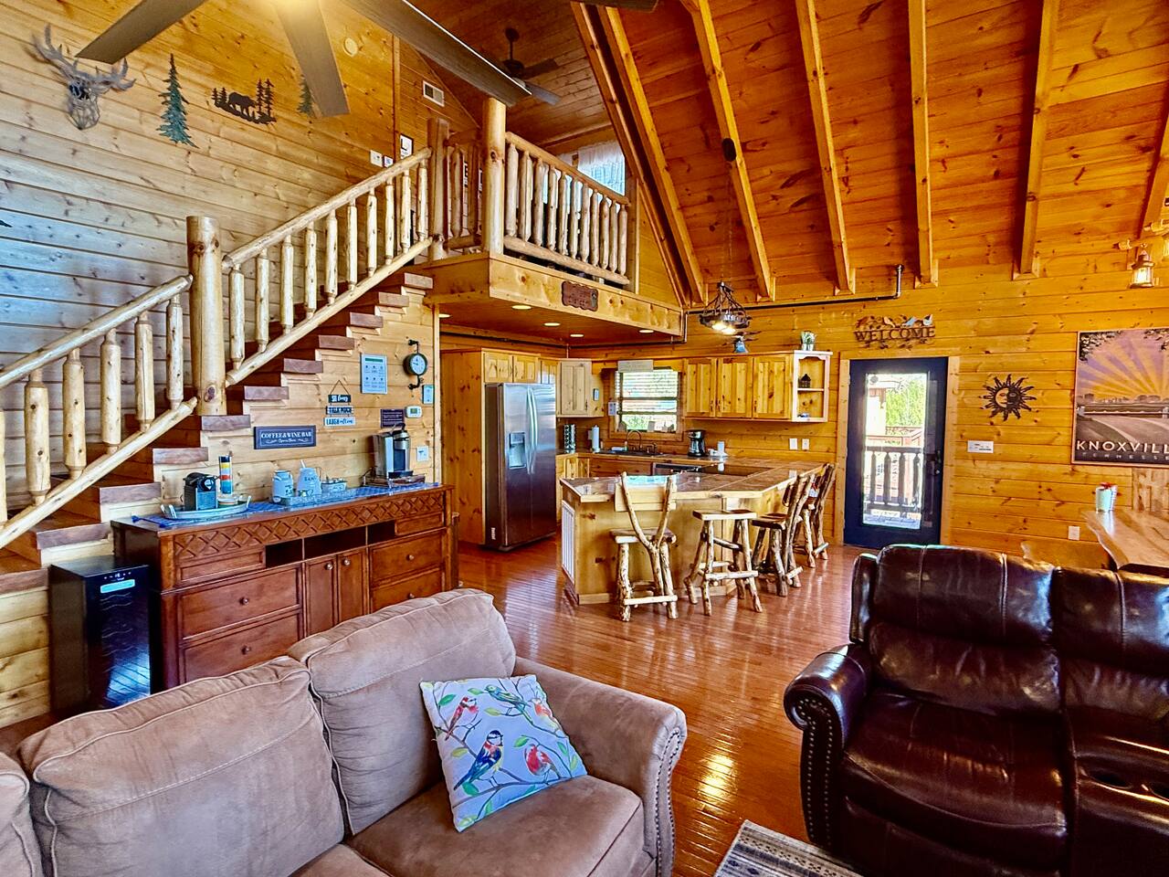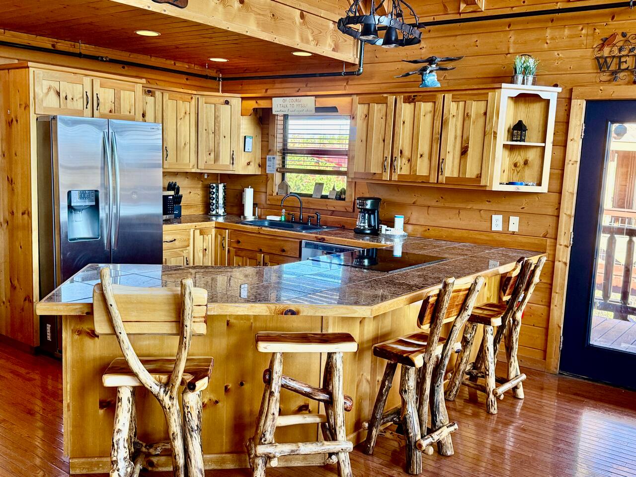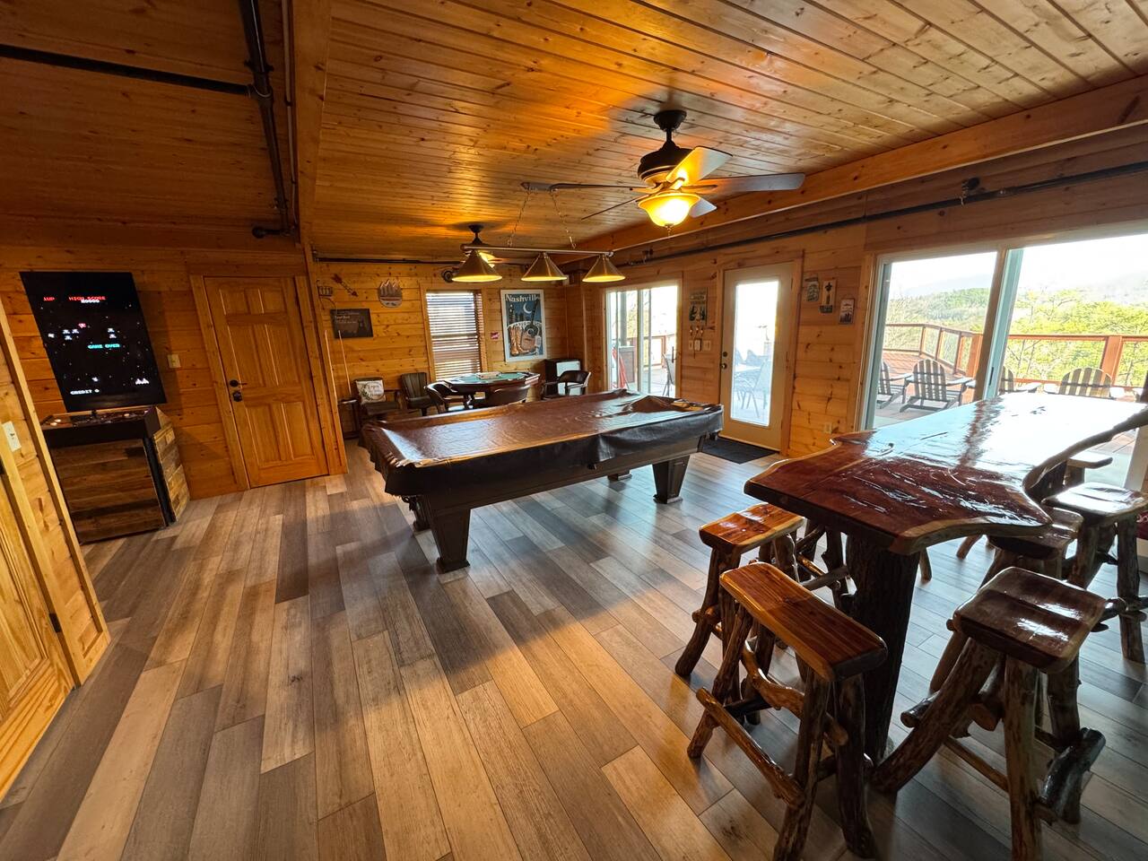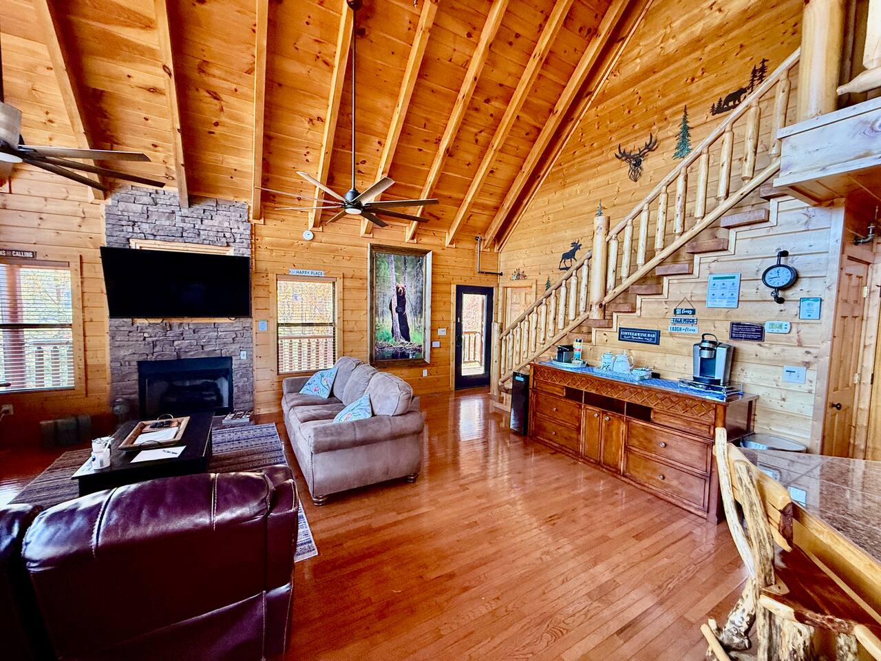 ✨ NEW OWNERS / NEW LISTING – Sunrise Oasis ✨ Welcome to Sunrise Oasis, a stunning 3,000 sq. ft. luxury Smoky Mountain retreat designed for relaxation and entertainment. The exterior space is truly one-of-a-kind, featuring a spectacular treehouse, observation deck overlooking the mountains, and a beautifully crafted outdoor kitchen, fire-pit, and game room. A huge event deck was completed in May 2025—perfect for unforgettable gatherings. $750 feet applies for events and 24 chairs and tables. Inside the Cabin Step inside to soaring windows framing unobstructed mountain views. The open floor plan features a spacious kitchen and dining area, fireside family room, and en suite bathrooms in every bedroom. Guests love hosting: family reunions, birthdays, corporate retreats, and getaways with friends. 🏡 MAIN LEVEL 🍽 Large Dining Room ⏲ Fully Equipped Kitchen 🪵 Fireside Family Room with TV 🚽 Powder Room 🛏 Master Suite (#1): King bed, TV, balcony access, private bath 🌄 OUTDOOR LIVING 🔥 Firepit Area (Firewood not provided) 🛀 Hot Tub 🥩 Gas Grill & Outdoor Kitchen 🌳 Treehouse 🌅 Wraparound Porches ☕️ Huge Deck for Morning Coffee & Scenic Views 🛌 SECOND FLOOR Bunk Room (#2): 3 bunk sets (Queen/Twin, Twin/Twin, Twin/Twin) + Full Bathroom and Loft 🎮 BASEMENT LEVEL 🛏 Bedroom #3: King Bed, TV, Full Bath 🛏 Bedroom #4: Queen Bed, TV, Full Bath ☀️ Balcony 🧺 Laundry Room 🎱 Game Room w/ Pool Table 🍸 Sports Bar & Poker Area 🐾 PET POLICY Up to 2 pets allowed (max 35 lbs each). $45/day per pet. Pets must be fully house trained. Owner responsible for outside cleanup—otherwise, a $200 fee applies. Please keep pets off furniture and beds. 🕓 EARLY CHECK-IN Available if no same-day checkout. $60/hour prior to 4 PM. 🔑 GUEST ACCESS You’ll receive a door code the day before arrival. Full private access to the home (some owner closets locked). Parking for up to 5 vehicles. 🔒 SAFETY Exterior cameras for added security 📺 TECH & CONNECTIVITY Wi-Fi throughout Smart TVs and/or ROKU 65” in main living room 75” in basement 65” in master bedroom 43” in bunk room ☕️ KITCHEN HIGHLIGHTS Fully stocked with: Full-size stove & refrigerator Keurig + Nespresso + Drip coffee makers Blender, toaster, crockpot, pressure cooker Air Fry, waffle maker Non-stick cookware, knife set, BBQ tools Hand and automatic Dishwashing detergent, and trash bags provided 🧺 LAUNDRY Washer & dryer and laundry detergent provided 🛏 LINENS & BATH Luxury bedding & extra pillows High-end towels & Turkish sets Shampoo, conditioner, soap, blow dryer in each bath Toilet paper provided